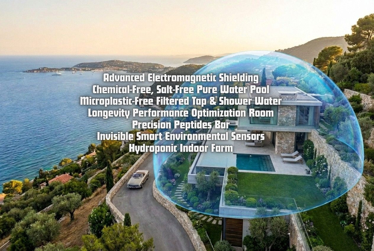 Eco-luxury smart homes engineered as true biological sanctuaries: hospital-grade air purification eliminating 99.999% of viruses, VOCs, and ultrafine particles; whole-home systems delivering structured, hydrogen-rich alkaline water; full-spectrum circadian lighting with automatic sunrise/sunset cycles; full EMF/5G shielding; living biophilic walls; grounding floors; and total acoustic isolation.