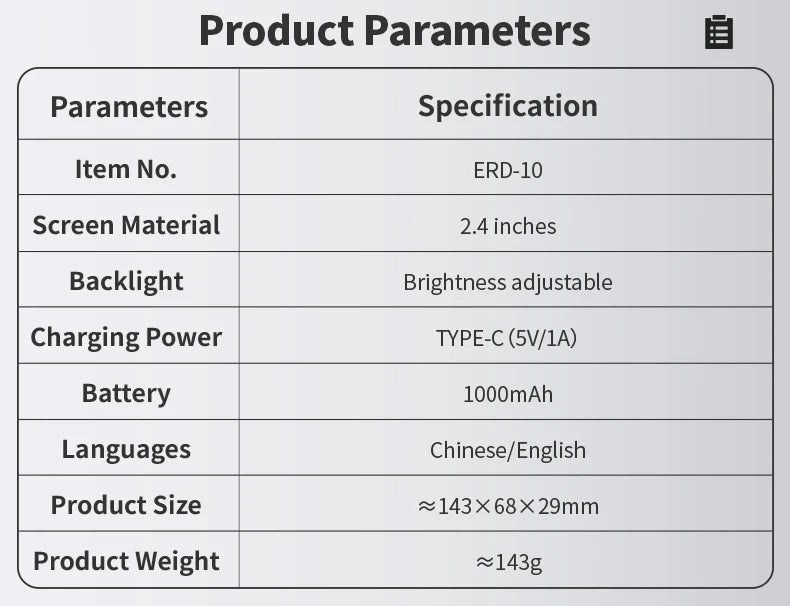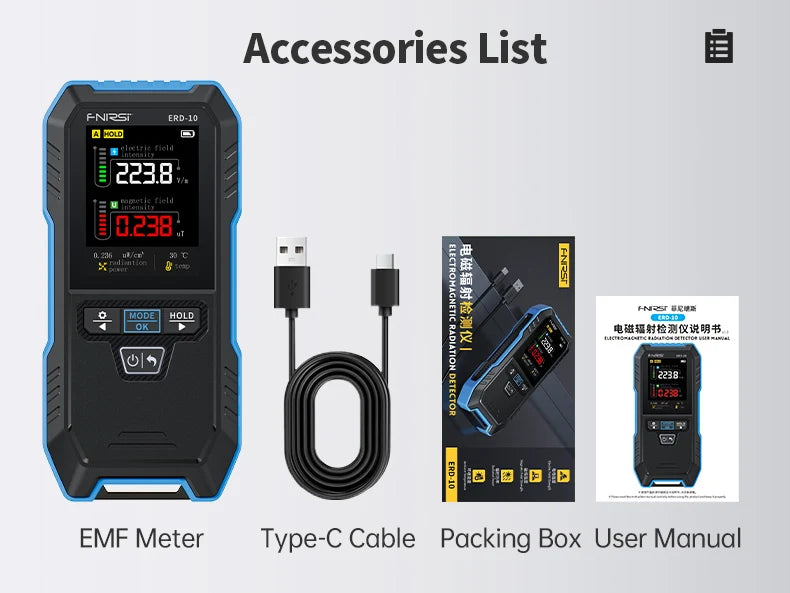The ERD-10 is an electromagnetic radiation detector, a professional instrument used for measuring electromagnetic radiation. It is suitable for various application scenarios, such as homes, offices, vehicles, and outdoor environments. It features a 2.4-inch high-definition color screen and supports monitoring of electric field strength, magnetic field strength, radiation power, and environmental temperature.